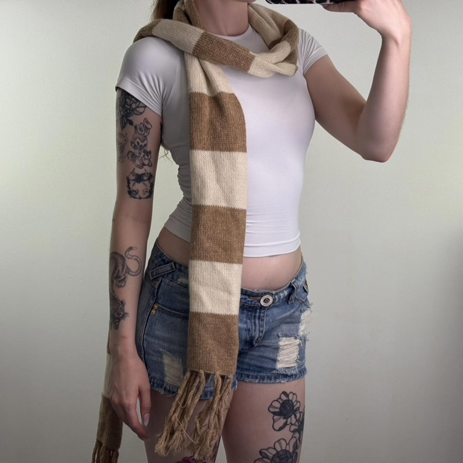 Y2K vintage wool blend stripe scarf long fringe cream light brown knitted knit