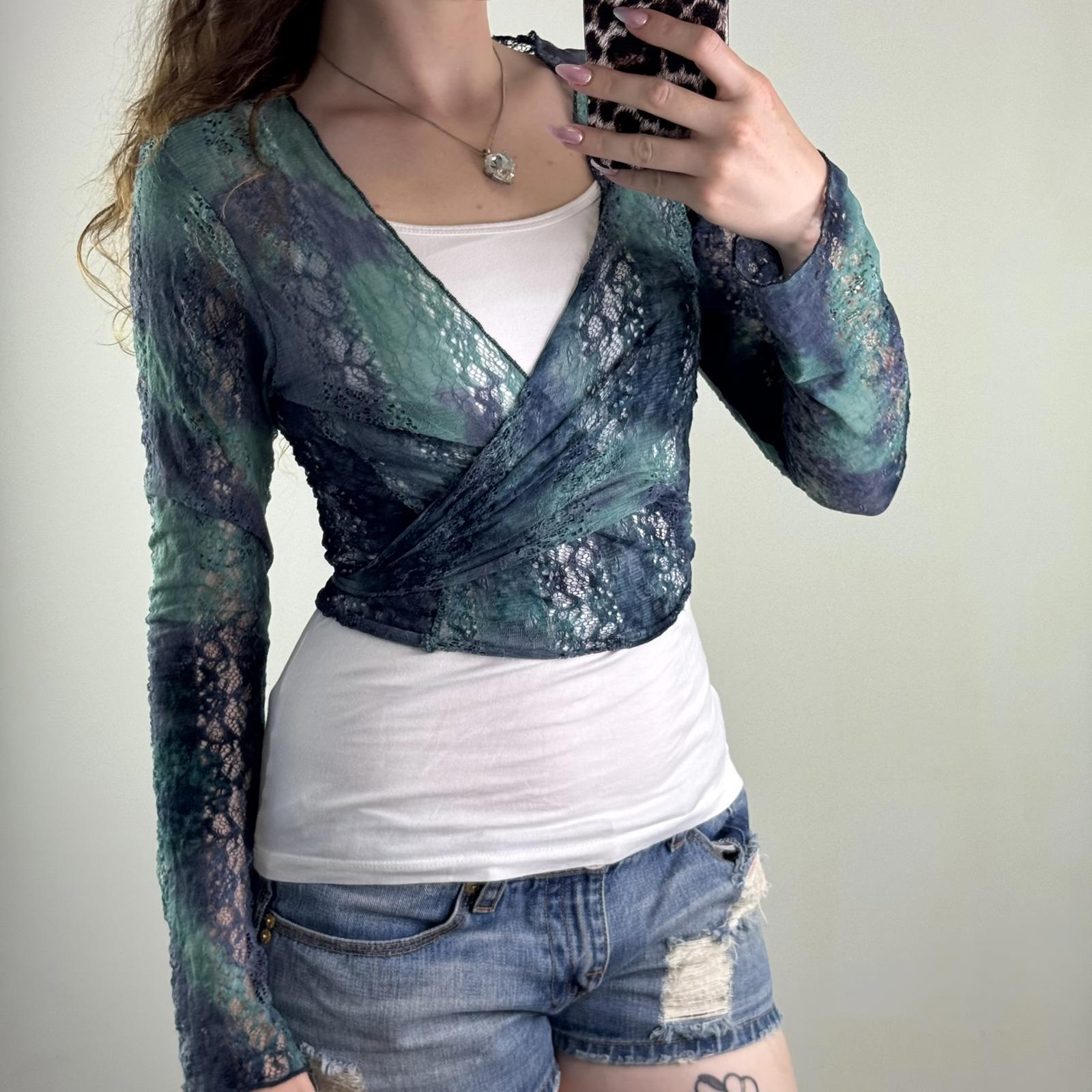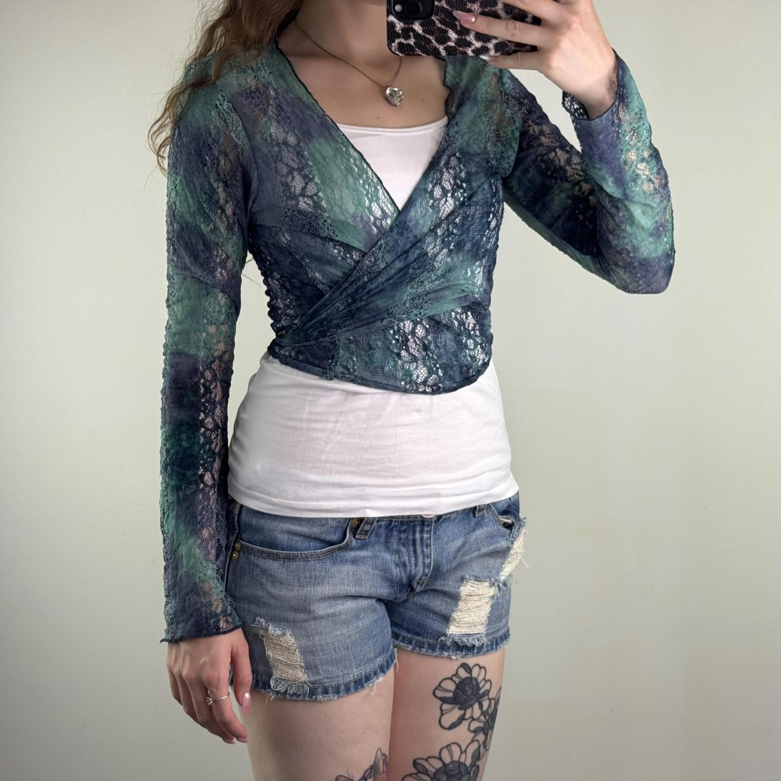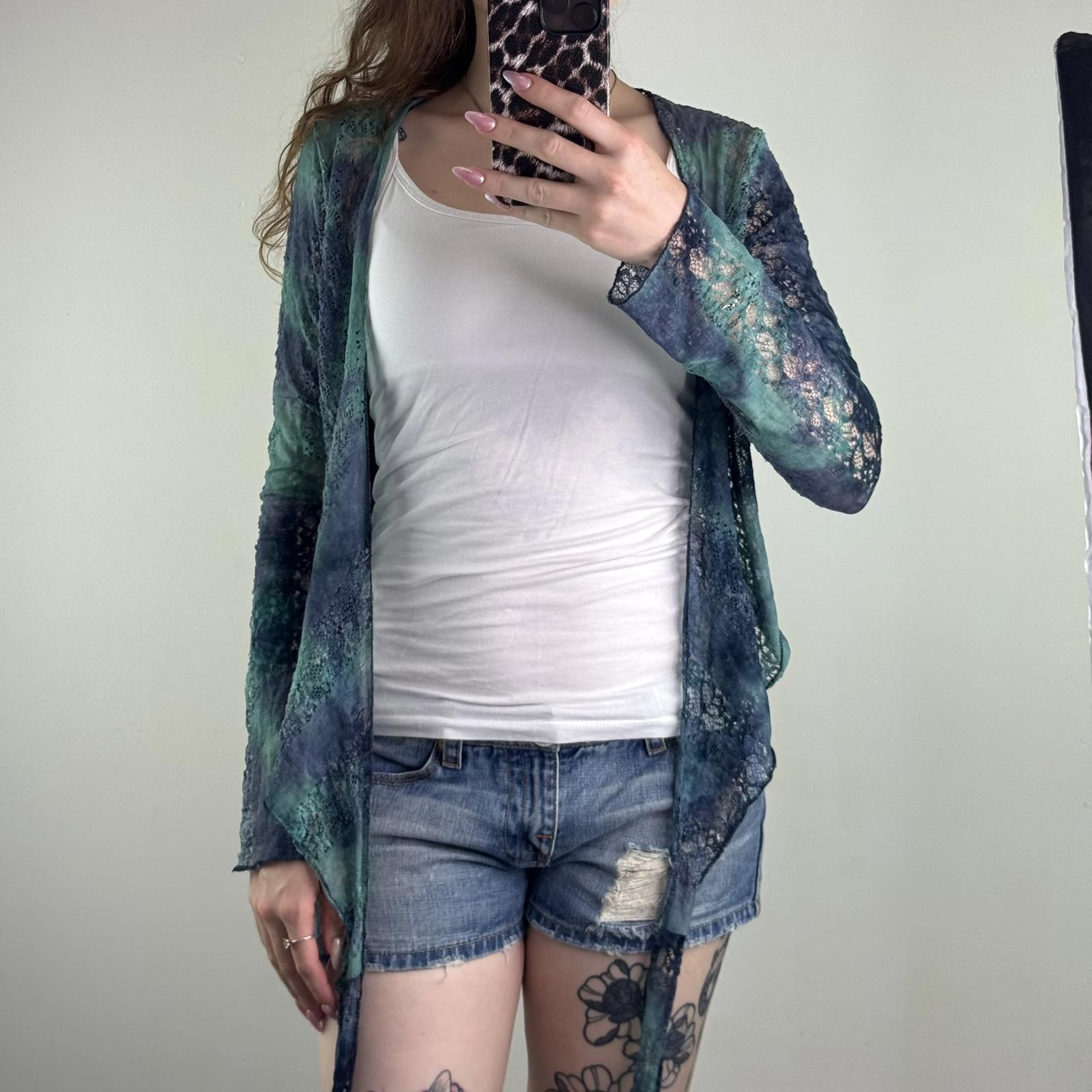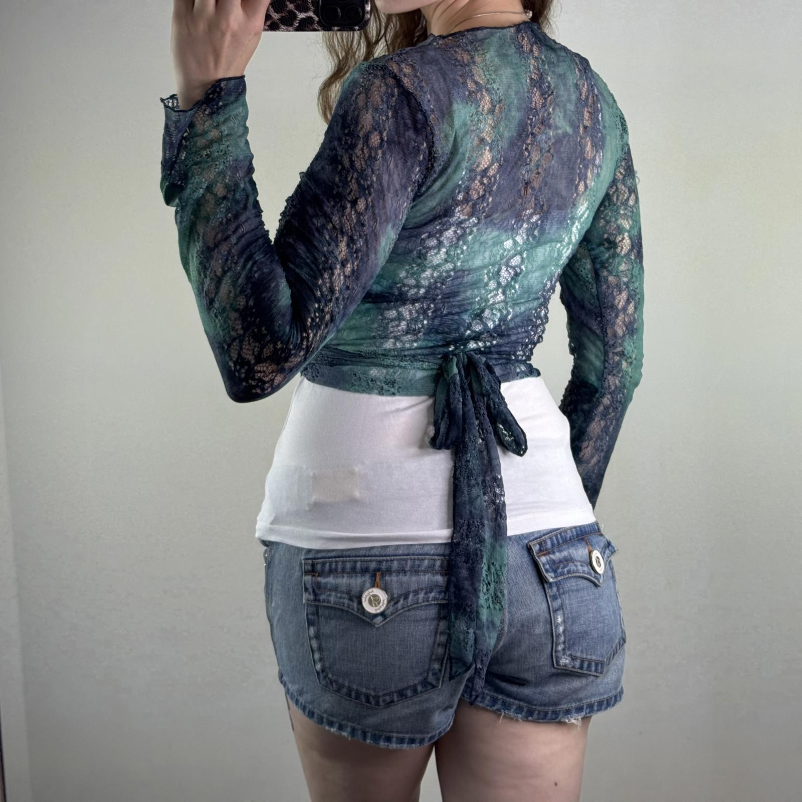 Y2K vintage wrap around cardigan sheer lace blue ombre tie bow adjustable